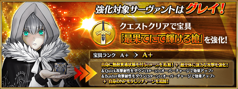 さらに、下記期間中すべてのイベントクエストにて「★4(SR)グレイ」の宝具威力が50%アップします!
