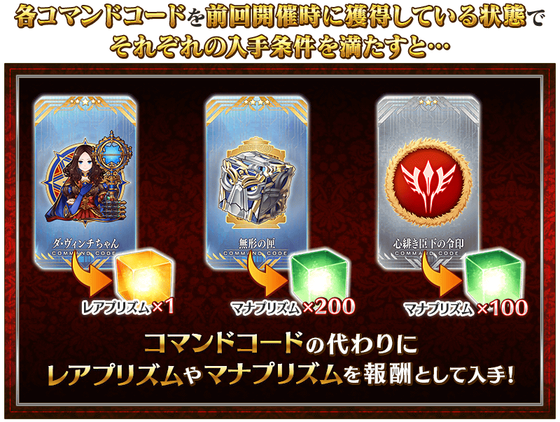 ※期間限定ロード・エルメロイⅡ世の事件簿×Fate/Grand Orderコラボレーションイベント「レディ・ライネスの事件簿」で獲得済みの各コマンドコードを霊基変還(売却)で失っている場合でも、期間限定ロード・エルメロイⅡ世の事件簿×Fate/Grand Orderコラボレーションイベント「復刻版:レディ・ライネスの事件簿 -Plus Episode-」での報酬はレアプリズムやマナプリズムに変化します。