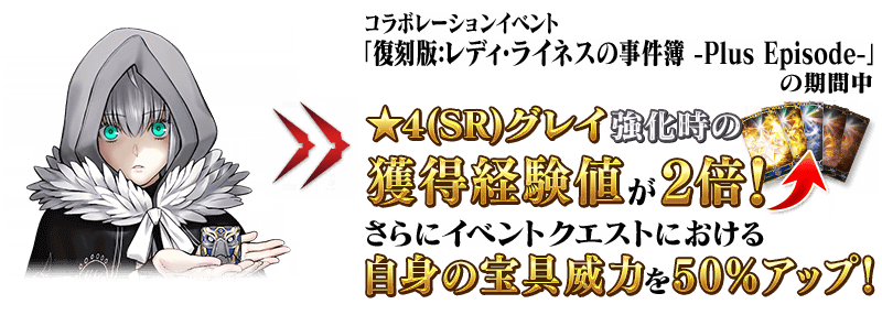 復刻前の期間限定ロード・エルメロイⅡ世の事件簿×Fate/Grand Orderコラボレーションイベント「レディ・ライネスの事件簿」で「★4(SR)グレイ」を入手していた場合は、本イベントで再入手特典を獲得可能です。