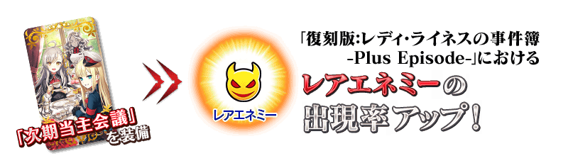 イベントアイテム交換やミッション報酬にて入手できるイベント限定概念礼装「★5(SSR)次期当主会議」を装備することで、クエストに低確率で現れるレアエネミーの出現率が15%アップします。