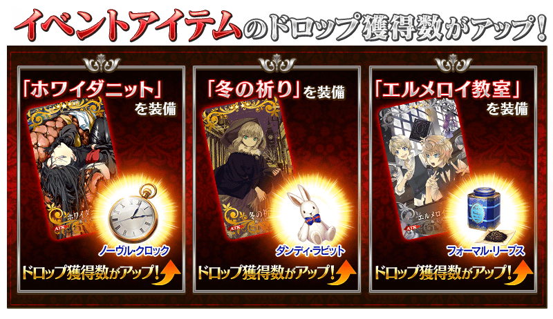 聖晶石召喚にてピックアップされる期間限定概念礼装「★5(SSR)ホワイダニット」「★4(SR)冬の祈り」「★3(R)エルメロイ教室」を装備することで、イベントアイテム「ノーヴル・クロック」「ダンディ・ラビット」「フォーマル・リーブス」それぞれのドロップ獲得数がアップします。