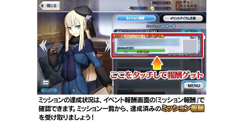 ※クリア条件を満たしただけでは、報酬は獲得できませんのでご注意ください。 ※ミッション報酬を受け取らないと、新たなミッションやスポットが開放されないことがありますのでご注意ください。