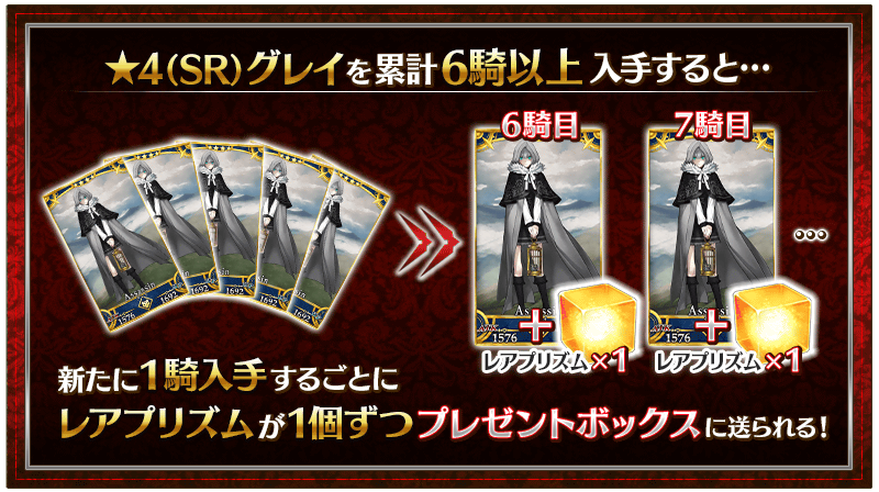 「★4(SR)グレイ」を「累計で6騎以上」入手すると、6騎目以降、新たに1騎入手するごとにレアプリズム1個がプレゼントボックスに送られます。