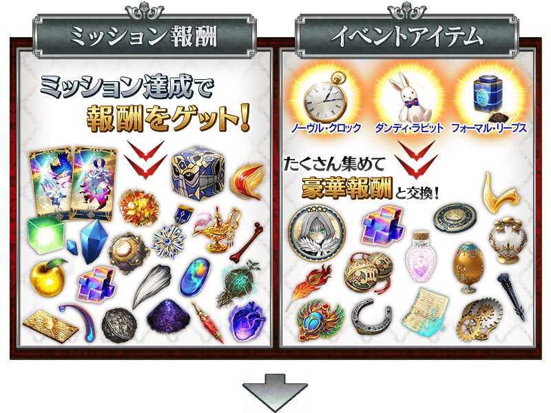 ※イベントアイテム交換期間終了後「ノーヴル・クロック」「ダンディ・ラビット」「フォーマル・リーブス」は消滅します。