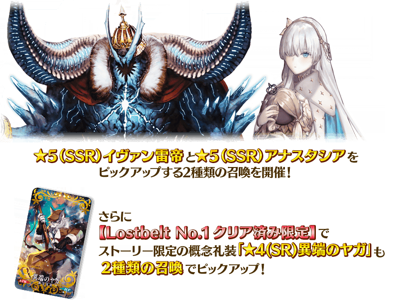※本召喚において、ストーリー限定の概念礼装「★4(SR)異端のヤガ」は第2部 第1章「Lostbelt No.1 永久凍土帝国 アナスタシア 獣国の皇女」をクリア済みの場合のみ排出され、ピックアップ対象となります。