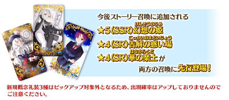 ※先行登場となる新規概念礼装3種はピックアップ対象外となるため、出現確率はアップしておりませんのでご注意ください。