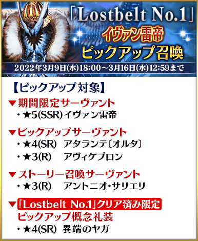 ※本召喚において、ストーリー限定の概念礼装「★4(SR)異端のヤガ」は第2部 第1章「Lostbelt No.1 永久凍土帝国 アナスタシア 獣国の皇女」をクリア済みの場合のみ排出され、ピックアップ対象となります。