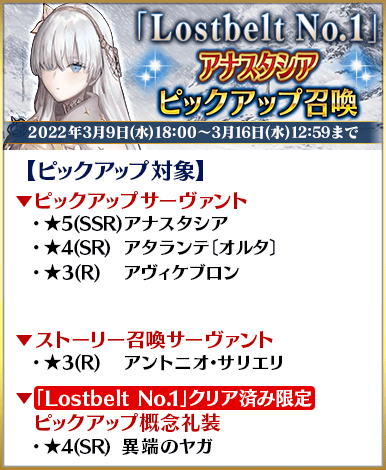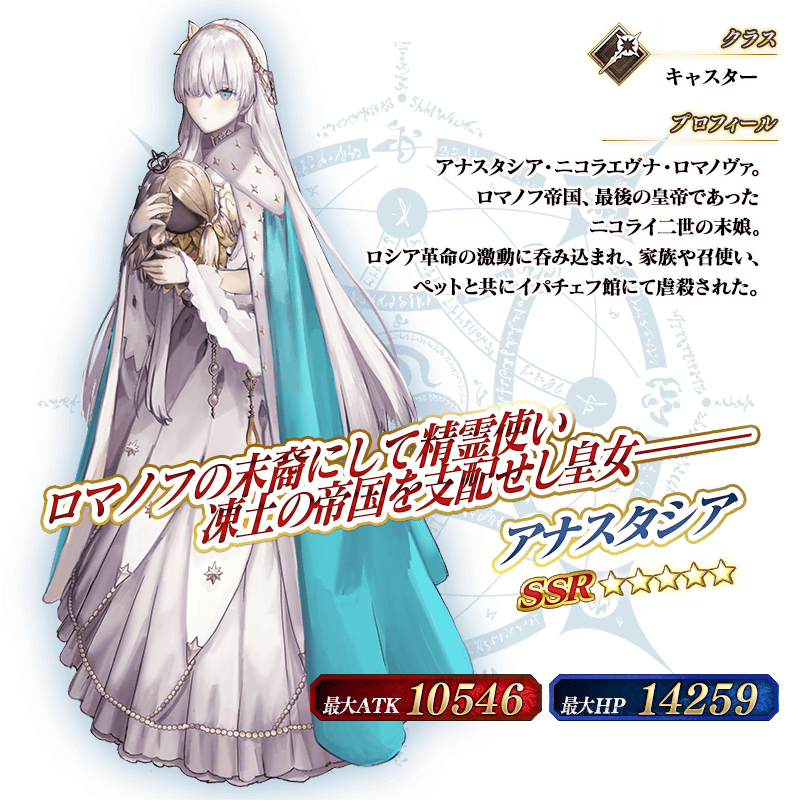 第2部 第1章「Lostbelt No.1 永久凍土帝国 アナスタシア 獣国の皇女」をクリアしていない場合はピックアップ対象外となり、本召喚では排出されませんのでご注意ください。