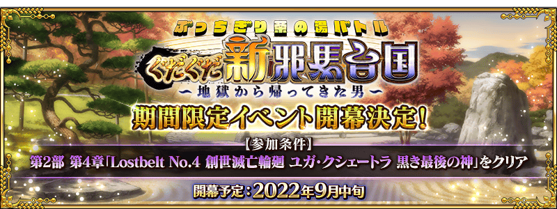 開幕予定の期間限定イベント「ぶっちぎり茶の湯バトル ぐだぐだ新邪馬台国 地獄から帰ってきた男」の参加条件も、第2部 第4章「Lostbelt No.4 創世滅亡輪廻 ユガ・クシェートラ 黒き最後の神」のクリアを予定していますので、この機会にクリアを目指しましょう!