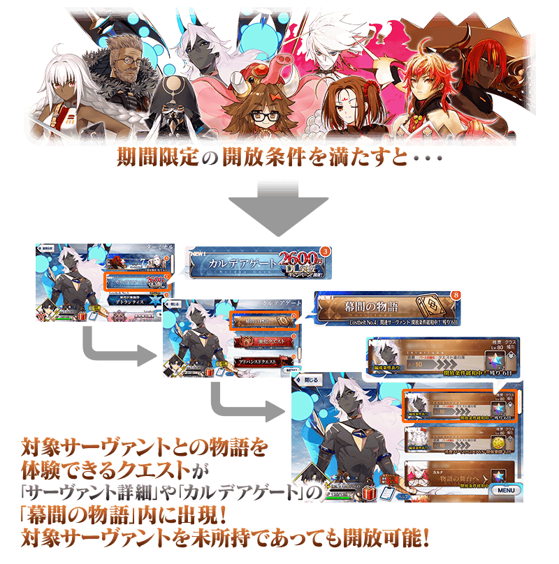 ※期間限定の開放条件を満たして「幕間の物語」をクリアした際に対象サーヴァントを未所持だった場合は、対象サーヴァントを入手したタイミングで強化内容が反映されます。 ※対象サーヴァントの「幕間の物語」を未所持の状態でクリアした場合でも、エクストラミッションの進行度にカウントされます。 ※対象サーヴァントの「幕間の物語」を、未クリアの状態で開催期間を過ぎた場合、対象サーヴァントの「幕間の物語」は未開放に戻り、通常の開放条件に切り替わります。 ※クエストクリア時の報酬内容に変化はございません。 ※すでに対象サーヴァントの幕間の物語をクリア済みの場合は、再度プレイすることはできません。