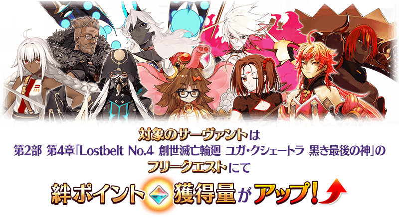 下記の期間中、クエスト開始時のサポート選択画面にて、他のマスターの第2部 第4章「Lostbelt No.4 創世滅亡輪廻 ユガ・クシェートラ 黒き最後の神」関連サーヴァントをサポートに選択した場合、または自身の対象サーヴァントが他のマスターのサポートに選択された場合、フレンドポイントの獲得量が2倍になります。