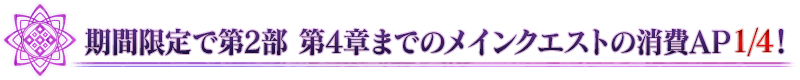 下記の期間中、メインクエスト第2部 第4章までの消費APが1/4になります!(バトルにおいて撤退した場合でも、同様の消費量になります)