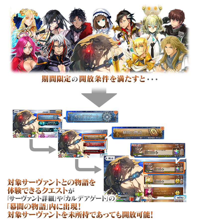 ※対象サーヴァントに複数の「幕間の物語」がある場合、全ての幕間の物語が対象となります。 ※期間限定の開放条件を満たして「幕間の物語」をクリアした際に対象サーヴァントを未所持だった場合は、対象サーヴァントを入手したタイミングで強化内容が反映されます。 ※対象サーヴァントの「幕間の物語」を未所持の状態でクリアした場合でも、エクストラミッションの進行度にカウントされます。 ※対象サーヴァントの「幕間の物語」を、未クリアの状態で開催期間を過ぎた場合、対象サーヴァントの「幕間の物語」は未開放に戻り、通常の開放条件に切り替わります。 ※クエストクリア時の報酬内容に変化はございません。 ※すでに対象サーヴァントの幕間の物語をクリア済みの場合は、再度プレイすることはできません。