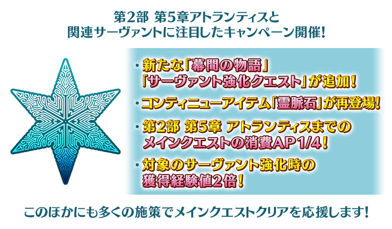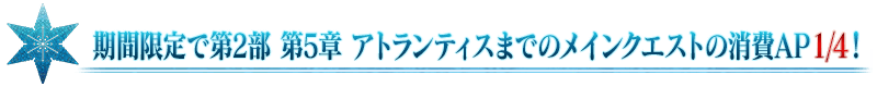 下記の期間中、第2部 第5章「Lostbelt No.5 神代巨神海洋 アトランティス 神を撃ち落とす日」関連サーヴァントの強化クエストと幕間の物語における消費APが1/2になります!(バトルにおいて撤退した場合でも、同様の消費量になります)