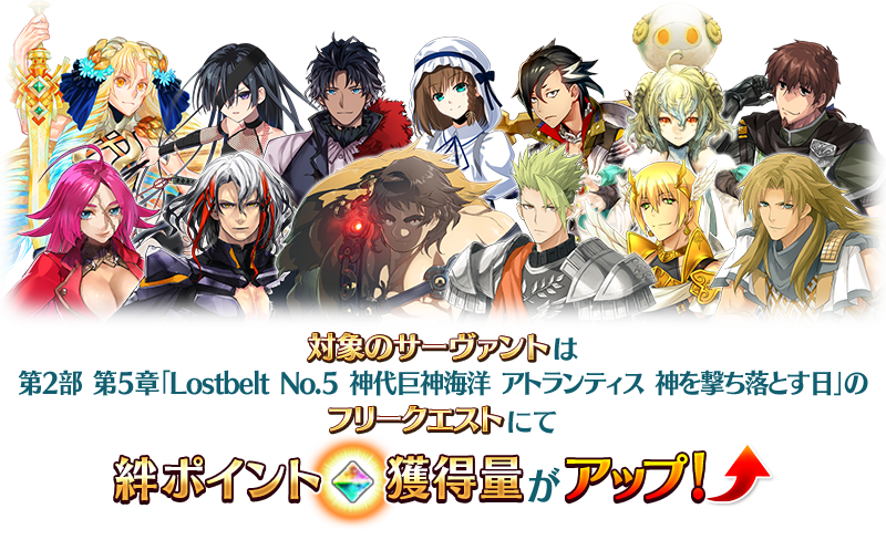下記の期間中、クエスト開始時のサポート選択画面にて、他のマスターの第2部 第5章「Lostbelt No.5 神代巨神海洋 アトランティス 神を撃ち落とす日」関連サーヴァントをサポートに選択した場合、または自身の対象サーヴァントが他のマスターのサポートに選択された場合、フレンドポイントの獲得量が2倍になります。