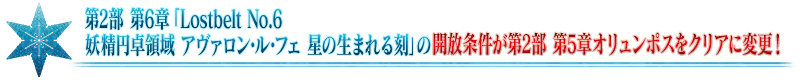 ■【恒常】第2部 第6章「Lostbelt No.6 妖精円卓領域 アヴァロン・ル・フェ 星の生まれる刻」の開放条件が第2部 第5章オリュンポスをクリアに変更!