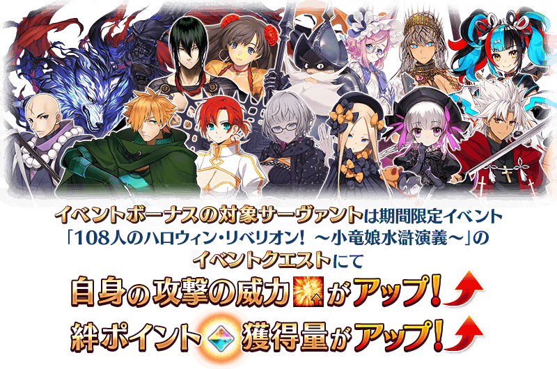※対象のサーヴァントとなっていても、本イベントのメインシナリオに登場しない場合があります。 ※10月7日(金) 22:00より、サーヴァント選択画面やサーヴァント強化画面などに、イベントボーナスフィルターが追加されております。イベントで活躍するサーヴァントのみを表示する便利な機能となりますので、こちらもあわせてご活用ください。