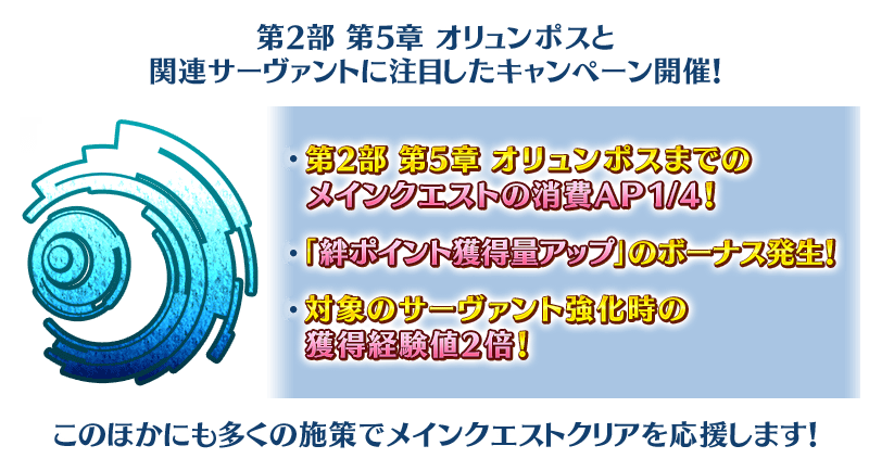下記の期間中、クエスト開始時のサポート選択画面にて、他のマスターの第2部 第5章「Lostbelt No.5 星間都市山脈 オリュンポス 神を撃ち落とす日」関連サーヴァントをサポートに選択した場合、または自身の対象サーヴァントが他のマスターのサポートに選択された場合、フレンドポイントの獲得量が2倍になります。