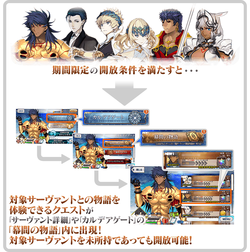 ※期間限定の開放条件を満たして「幕間の物語」をクリアした際に対象サーヴァントを未所持だった場合は、対象サーヴァントを入手したタイミングで強化内容が反映されます。 ※対象サーヴァントの「幕間の物語」を未所持の状態でクリアした場合でも、エクストラミッションの進行度にカウントされます。 ※対象サーヴァントの「幕間の物語」を、未クリアの状態で開催期間を過ぎた場合、対象サーヴァントの「幕間の物語」は未開放に戻り、通常の開放条件に切り替わります。 ※クエストクリア時の報酬内容に変化はございません。 ※すでに対象サーヴァントの幕間の物語をクリア済みの場合は、再度プレイすることはできません。