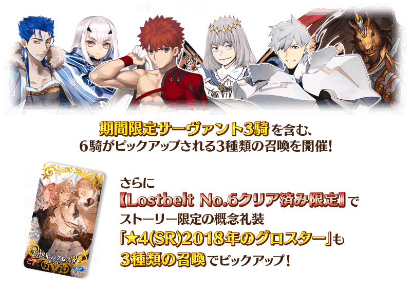 ※本召喚において、ストーリー限定の概念礼装「★4(SR)2018年のグロスター」は第2部 第6章「Lostbelt No.6 妖精円卓領域 アヴァロン・ル・フェ 星の生まれる刻」をクリア済みの場合のみ排出され、ピックアップ対象となります。