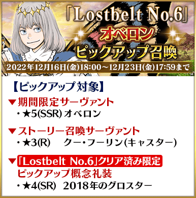 第2部 第6章「Lostbelt No.6 妖精円卓領域 アヴァロン・ル・フェ 星の生まれる刻」をクリアしていない場合はピックアップ対象外となり、本召喚では排出されませんのでご注意ください。