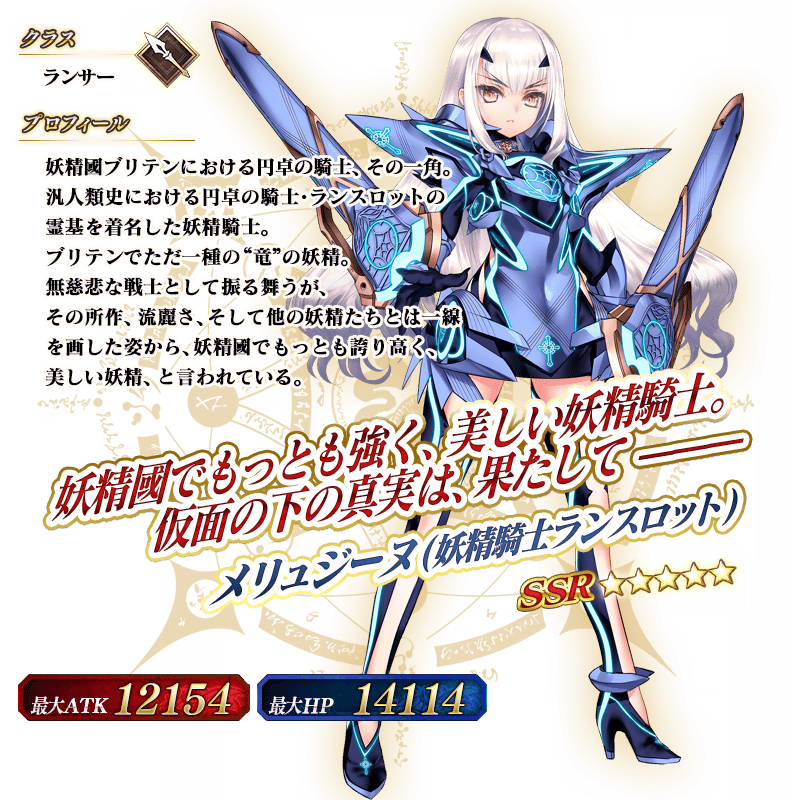 ※「★5(SSR)メリュジーヌ(妖精騎士ランスロット)」は、「妖精騎士ランスロット」を霊基再臨第2段階にすることで名称が「メリュジーヌ」に変化します。