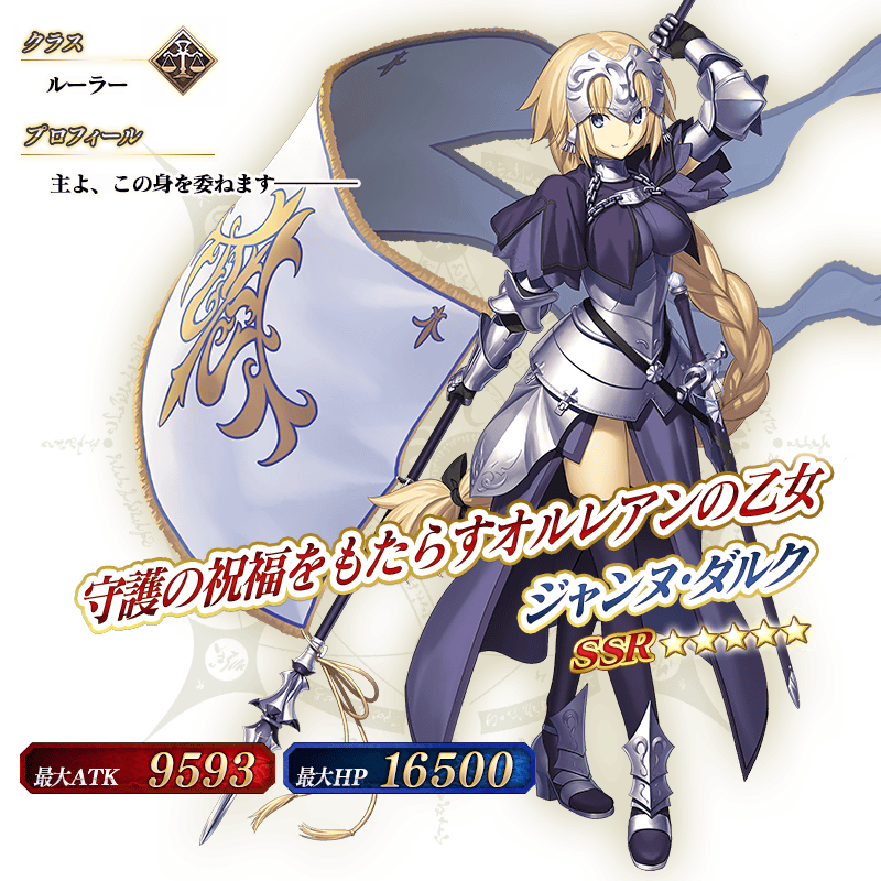 ※上記の「★5(SSR)ジャンヌ・ダルク(ルーラー)」のイラストは霊基再臨第2段階のものです。