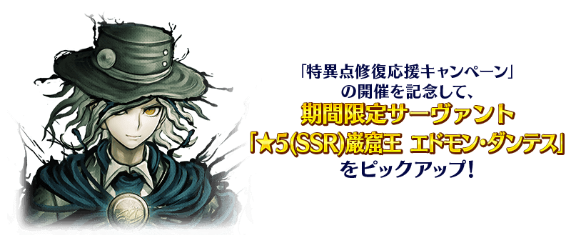 「特異点修復応援キャンペーン」の開催を記念して、「★5(SSR)巌窟王 エドモン・ダンテス」をピックアップする召喚を開催いたします!