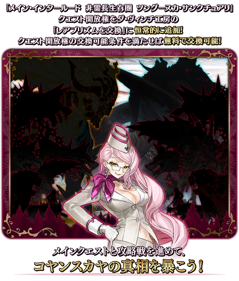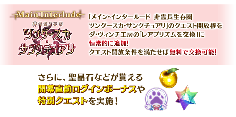 「メイン・インタールード 非霊長生存圏 ツングースカ・サンクチュアリ」のクエスト開放権をダ・ヴィンチ工房の「レアプリズムを交換」に恒常的に追加いたします。