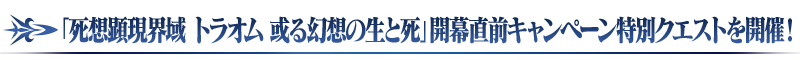 「死想顕現界域 トラオム 或る幻想の生と死」開幕直前キャンペーン特別クエストはクリア後も消滅せず、何度でも挑戦することが可能です。 ※クエストクリア報酬、戦利品、マスターEXP、魔術礼装EXP、絆ポイントを獲得できるのは初回クリア時のみです。 ※「死想顕現界域 トラオム 或る幻想の生と死」開幕直前キャンペーン特別クエストはクエスト失敗となった場合、コンティニューすることはできませんのでご注意ください。