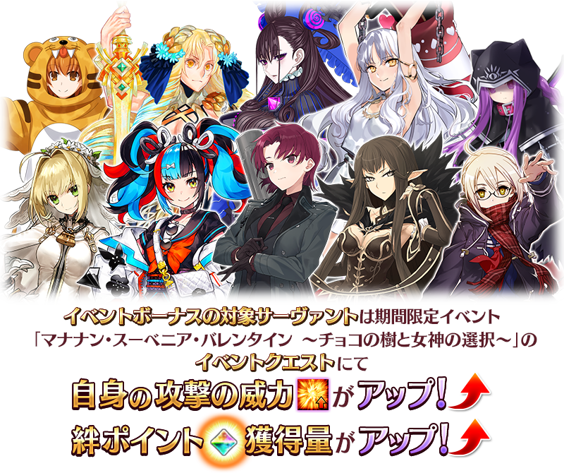 ※対象のサーヴァントとなっていても、本イベントのメインシナリオに登場しない場合があります。 ※アムール〔カレン〕は霊基再臨をおこなうことで、セイントグラフの名称がカレン・C・オルテンシアに変化します。 ※2月2日(水) 18:00より、サーヴァント選択画面やサーヴァント強化画面などに、イベントボーナスフィルターが追加されております。イベントで活躍するサーヴァントのみを表示する便利な機能となりますので、こちらもあわせてご活用ください。