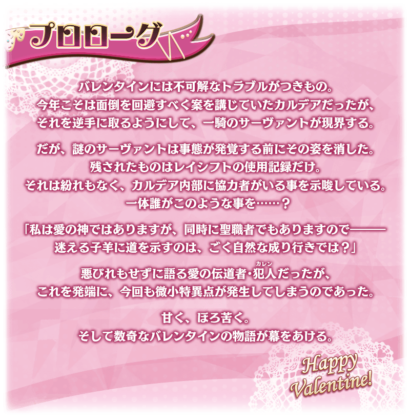 ※バレンタインのプレゼントを受け取ることのできるサーヴァントは、召喚履歴のあるサーヴァントのみとなります。召喚履歴の無いサーヴァントは対象外となりますのでご注意ください。 ※「★5(SSR)オベロン」からバレンタインのプレゼントを受け取るには、第2部 第6章「Lostbelt No.6 妖精円卓領域 アヴァロン・ル・フェ 星の生まれる刻」をクリアしている必要があります。 ※「★5(SSR)オベロン」からバレンタインのプレゼントを受け取る条件を満たしていない場合、チョコをわたした際のアドベンチャーパートはマテリアルに登録されませんのであらかじめご注意ください。 ※2021年以前のイベントで入手したプレゼント(概念礼装)を所持している場合でも、プレゼントをもらうイベントを発生させることができ、同一のプレゼントであっても複数所持できます。 ※一部のサーヴァントの特別なメッセージはフルスクリーン表示に未対応となります。