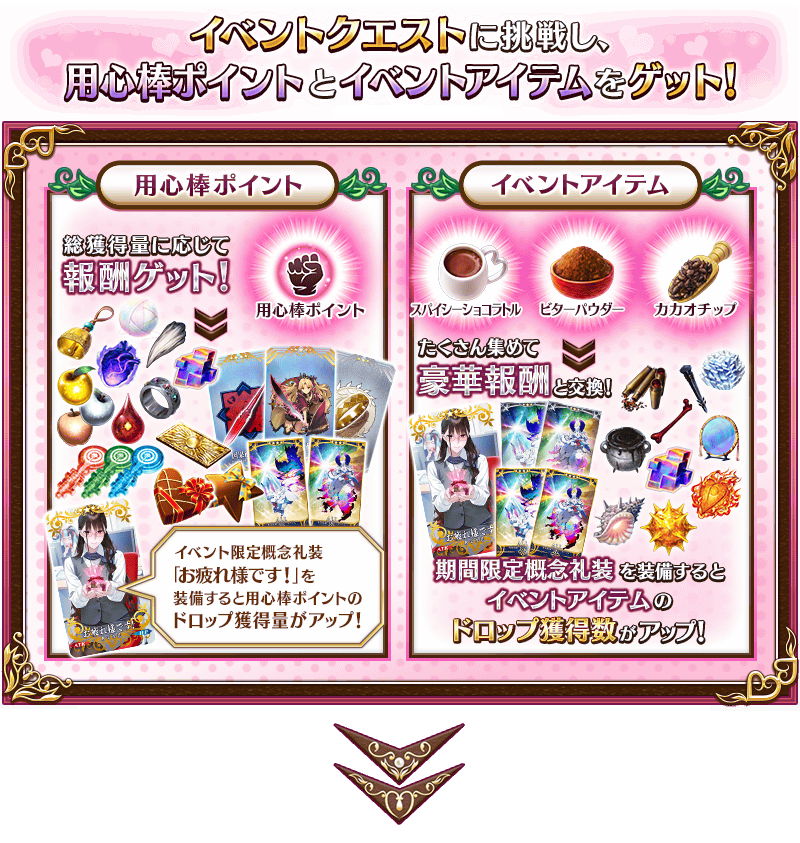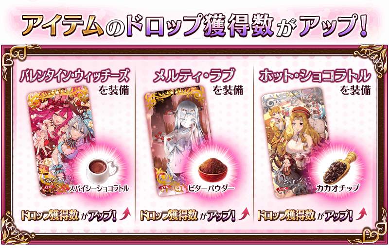 聖晶石召喚にてピックアップされる期間限定概念礼装「★5(SSR)バレンタイン・ウィッチーズ」「★4(SR)メルティ・ラブ」「★3(R)ホット・ショコラトル」を装備することで、イベントアイテム「スパイシーショコラトル」「ビターパウダー」「カカオチップ」それぞれのドロップ獲得数がアップします。