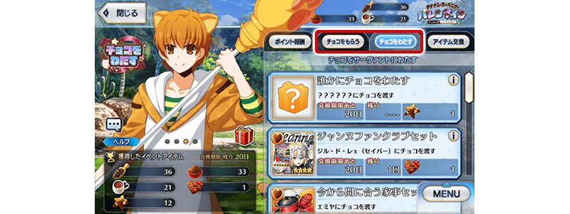 イベントアイテム交換で「チョコをもらう」または「チョコをわたす」を選択