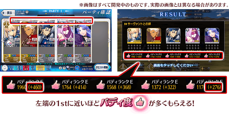 なお、バディ度はパーティ編成時の編成位置によって上昇量が変動し、左端の1stに近いほどバトルに勝利した際により高くバディ度がアップします。
