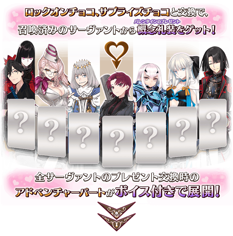 ※「ロックオンチョコ」「サプライズチョコ」をわたしてバレンタインのプレゼントを受け取ることのできるサーヴァントは、召喚履歴のあるサーヴァントのみとなります。 ※本イベントでは、プレゼントを受け取る際のアドベンチャーパート開始前に都度必要なボイスをダウンロードしており、従来よりもデータ通信量が増加します。詳しくはこちらのお知らせをご覧ください。