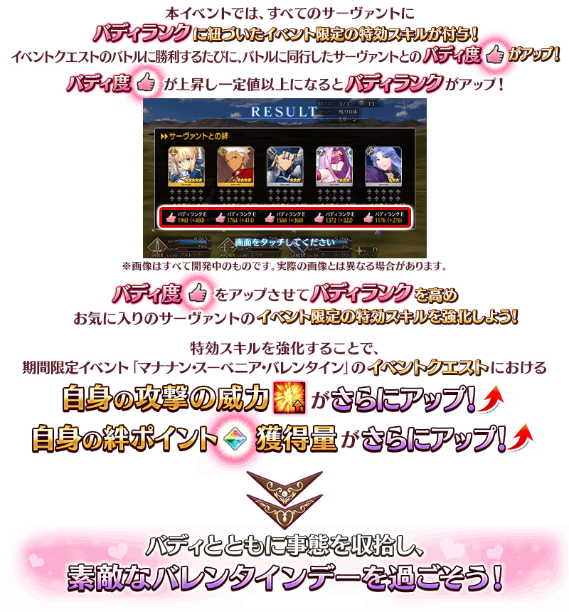本イベントの期間中、すべてのサーヴァントはバディランクに紐づいたイベント限定の特効スキルが付与されます。