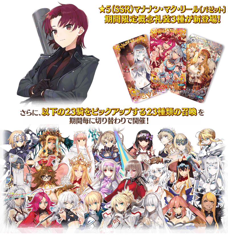 期間限定イベント「マナナン・スーベニア・バレンタイン ~チョコの樹と女神の選択~」の開催を記念して、新登場の期間限定サーヴァント「★5(SSR)マナナン・マク・リール〔バゼット〕」と、期間限定概念礼装3種をピックアップ!