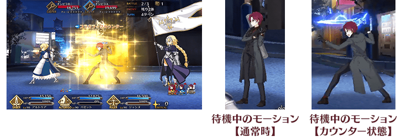 「カウンター」状態のサーヴァントは待機時のモーションが専用のモーションに変化するほか、エネミーなどから攻撃(宝具またはチャージ攻撃を含む)を受ける、もしくはスキルの対象(NP減少や攻撃力ダウンなど)になった際、それらの行動終了後にそのエネミーに対してカウンターによる反撃をおこないます。同一のエネミーが連続で攻撃してくる場合でも、被ダメージ後に都度カウンターによる反撃をおこないます。