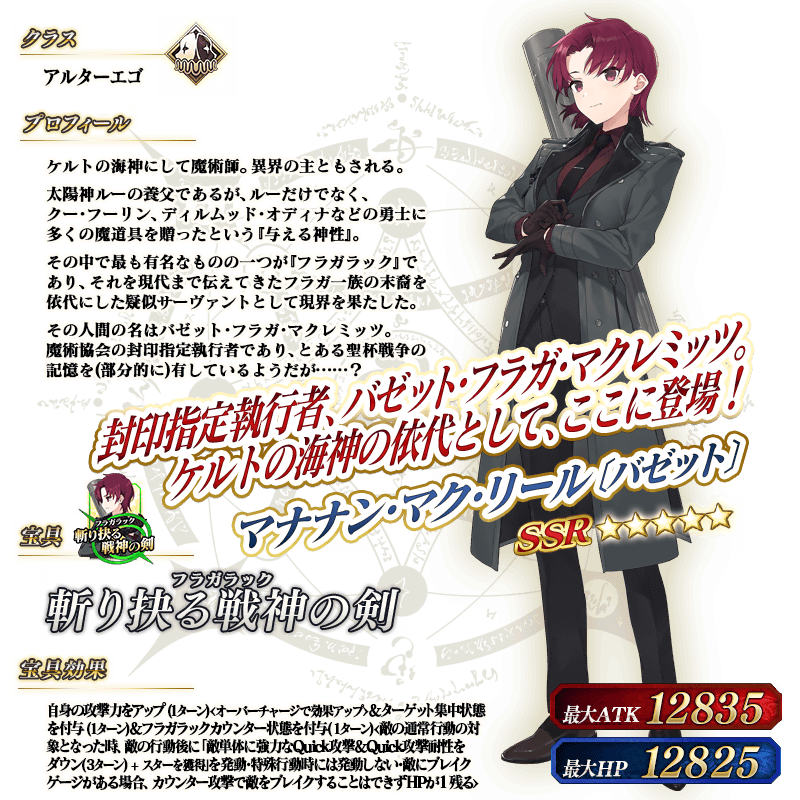 ※「★5(SSR)マナナン・マク・リール〔バゼット〕」の宝具名は再臨段階によって変化いたします。