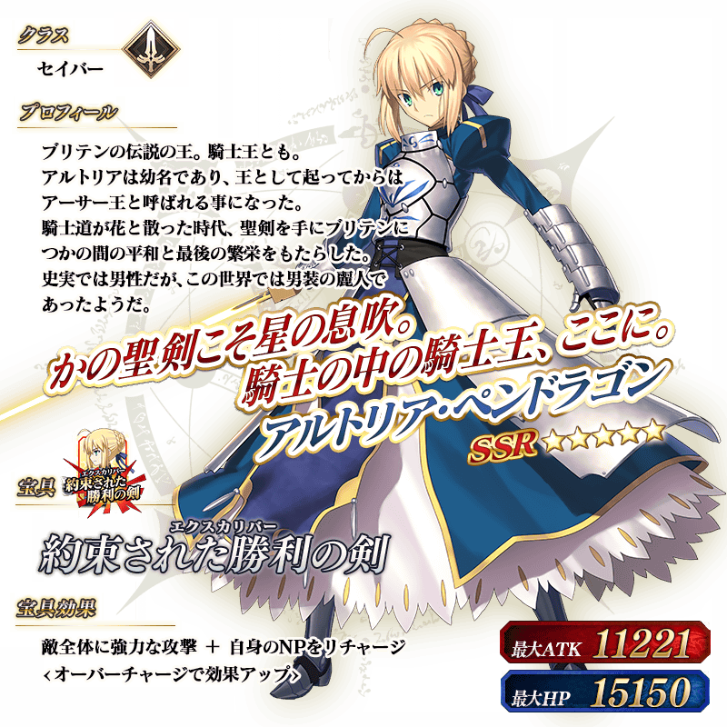 ※上記の「★5(SSR)アルトリア・ペンドラゴン(セイバー)」のイラストは霊基再臨第2段階のものです。