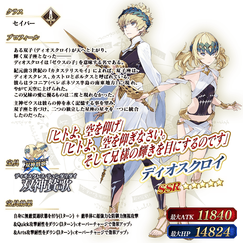 ※上記の「★5(SSR)ディオスクロイ」のイラストは霊基再臨第2段階のものです。