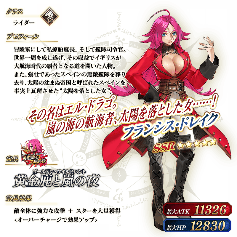 ・★5(SSR)アルテラ ・★5(SSR)アルトリア・ペンドラゴン(セイバー) ・★5(SSR)ディオスクロイ ・★5(SSR)モードレッド(セイバー) ・★5(SSR)アルトリア・ペンドラゴン(ランサー) ・★5(SSR)ヴリトラ ・★5(SSR)ケツァル・コアトル ・★5(SSR)女王メイヴ(ライダー) ・★5(SSR)フランシス・ドレイク ・★5(SSR)玄奘三蔵 ・★5(SSR)シェヘラザード(不夜城のキャスター) ・★5(SSR)玉藻の前(キャスター) ・★5(SSR)刑部姫(アサシン) ・★5(SSR)ジャック・ザ・リッパ― ・★5(SSR)ガラテア ・★5(SSR)ナイチンゲール ・★5(SSR)ジャンヌ・ダルク(ルーラー)