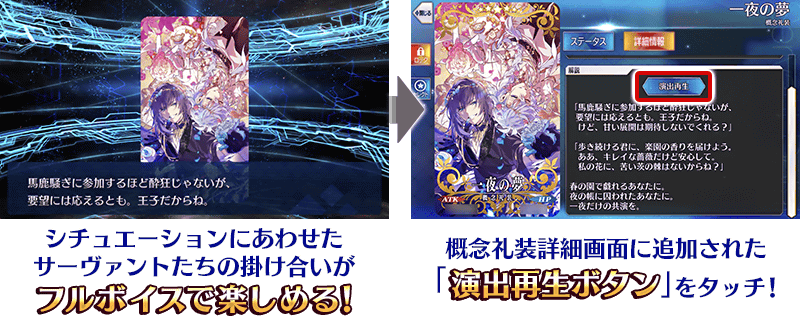 また、概念礼装詳細画面に「演出再生ボタン」が追加され、ボタンをタッチするとその概念礼装を入手した際の初回召喚演出を再生できます。