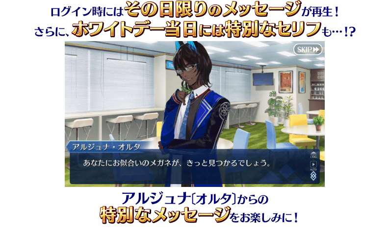 現在開催中の「ホワイトデー・スペクタクルズ」の期間限定ログインボーナスについて、「ログインボーナス」というログインするのみで報酬を獲得できるかのような表現をしておりましたが、正確には報酬の獲得条件は「ログインした後に再生されるアルジュナ〔オルタ〕からのメッセージを最後まで再生することで報酬を受け取ることができる」というものとなります。