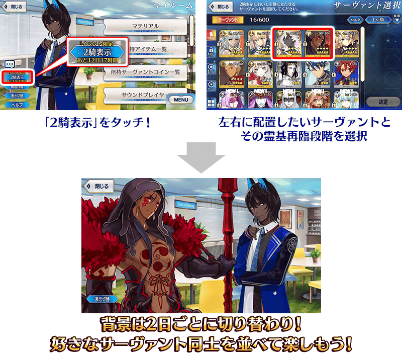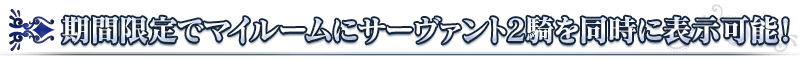 「ホワイトデー・スペクタクルズ」の開催を記念して、期間限定でマイルームに任意のサーヴァントを2騎配置できるようになります。