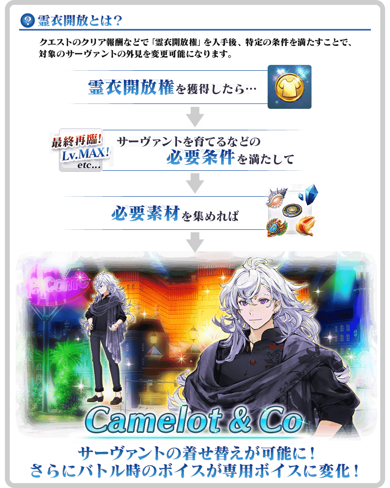 2019年に開催された期間限定イベント「見参! ラスベガス御前試合~水着剣豪七色勝負!」および2020年に開催された「復刻:見参! ラスベガス御前試合~水着剣豪七色勝負! ライト版」で登場した、「★5(SSR)マーリン」の霊衣「Camelot & Co」開放権をダ・ヴィンチ工房の「霊衣縫製」に追加!