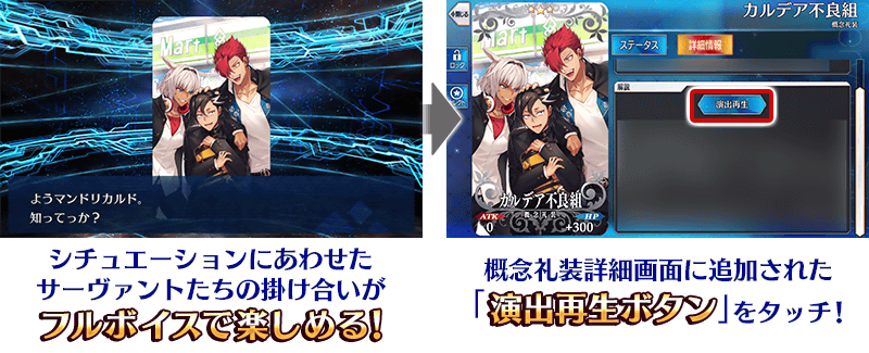 また、概念礼装詳細画面に「演出再生ボタン」が追加され、ボタンをタッチするとその概念礼装を入手した際の初回召喚演出を見返すことができます。