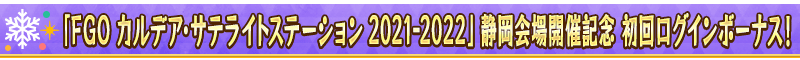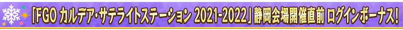 下記の期間中、「FGO カルデア・サテライトステーション 2021-2022」静岡会場開催を記念して、「FGO カルデア・サテライトステーション 2021-2022」静岡会場開催直前ログインボーナスを実施いたします!