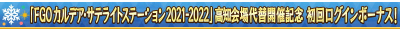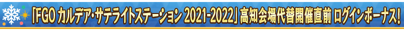 下記の期間中、「FGO カルデア・サテライトステーション 2021-2022」高知会場代替開催を記念して、「FGO カルデア・サテライトステーション 2021-2022」高知会場代替開催直前ログインボーナスを実施いたします!